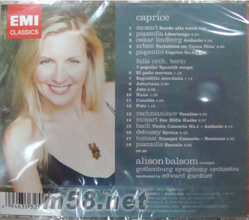美女小號 CAPRICE(m58.net) alison balsom(艾麗森·巴爾松)1978年10月7日生于英國。1999年進入法國國立高等音樂學院。得獎經歷:1997年獲john fletcher銅管大賽優勝獎;1998年獲得bbc年度銅管青年演奏家稱號;1999年獲倫敦交響樂團招考半準決賽入圍; 1996/1997/1999年倫敦與南郡銅管樂隊獨奏大賽優勝。 在第四屆莫里斯·安德烈國際小號比賽中獲得第三名和最具美感音色獎。她近來被任命為市府音樂及戲劇學校的小號訪問學者,并被英國古典音樂獎評為年度最佳青年英國表演者。 美女小號演奏家alison balsom最近推出了一張全新專輯名為《caprice》。在今次的專輯中和他拍檔的是歌登堡交響樂團,由edward gardner擔任指揮。 在今次的專輯中alison balsom更大膽地把這個改編的范圍加大至涉及到各個時期的作曲家作品。當中有改編莫扎特《第11鋼琴奏鳴曲》《夜后詠嘆調》、法雅的《7首流行的西班牙歌曲》、帕格尼尼的《隨想曲第24號》、巴赫《第一小提琴協奏曲》等等大家耳熟能祥的曲目一共18首。通過不同時期的作品反映出了alison balsom高超的小號演奏技巧,而且錄音也相當出色。