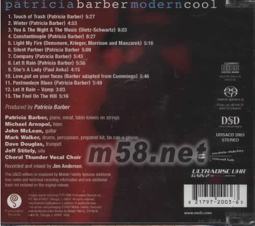 MODEN COOL GOLD SACD(m58.net) 挪威著名的Jazz女歌手,發(fā)燒大廠Mobile Fidelity以SACD模式重新發(fā)行這張?jiān)缫严碜u(yù)樂界的「Modern Cool」,是基于何種考量因素?他們?cè)阡浺粜Ч系降壮删土撕蔚蓉S功偉業(yè)?而芝加哥精銳樂手與上了當(dāng)今炙手可熱的爵士女伶Patricia Baber,能夠帶給您多少音樂聆賞上的滿足呢? 事實(shí)上,爵士樂界的一級(jí)女歌手Patricia Baber,早就是他們覬覦觸探、也是最有興趣為其制作唱片的樂手,她那種純粹心靈揣摩式的演繹法,即使面對(duì)早已麻痹于五彩聲光的聽眾,也能輕易挑起沉淀多時(shí)的心靈悸動(dòng)。小號(hào)手Dave Douglas以及吉他手John McLean完美的扶襯,更是為本張唱片錦上添花。 而以DSD技術(shù)重新升頻取樣后的SACD,到底在音質(zhì)上有什么優(yōu)勢(shì)呢?首先,回放時(shí)的三度空間感更加優(yōu)異,親臨現(xiàn)場(chǎng)的氛圍也會(huì)更為濃郁;再來,高頻與極高頻響應(yīng)會(huì)更加平整,聽感上會(huì)呈現(xiàn)出一種CD唱片無法企及的自然通透和真實(shí)性;另外,樂器與人聲的細(xì)節(jié)、微細(xì)節(jié)再現(xiàn),更是以往所有唱片規(guī)格萬萬比不上的高成就。