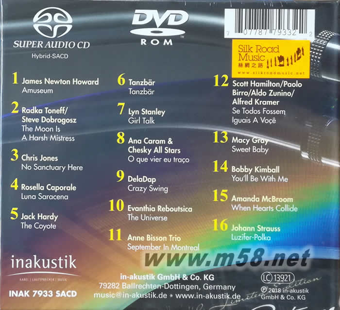 1. Amuseum/James Newton Howard多手仔(Sheffield Lab) 2. The Moon Is A Harsh Mistress/Radka Toneff & Steve Dobrogosz (Odin Records) 3. No Santuary Here/Chris Jones (Stockfisch Records) 4. Luna Saracena/ Rosella Caporale (Velut Luna) 5. The Coyote/Jack Hardey (Great Divide Records) 6. Tanzbar /Nature(2) (Clearaudio,Nature[2]) 7. Girl Talk/Lyn Stanley (A.T.Music) 8. O quer vier eu traco./Aria Caram (Chesky) 9. Crazy Swing/DelaDap (Chat Chapeau Records) 10. The Universe/Evanthia Reboutisica (Cantini) 11. September In Montreal/Anne Bisson Trio(Fidelio) 12. Se Todos Fossem Iguais A Voce/Scott Hamilton, Paolo Bisso, Aldo Zunino, Alfred Kramer (Fone) 13. Sweet Baby /Macy Gray (Epic) 14. You'll Be With Me /Bobby Kimball (in-akustik) 15. When Hearts Collide/Amanda McBroom (Gecko Records) 16. Luzifer Polka/Eiji Oue & Minnesota Orchestra (Reference Recordings)