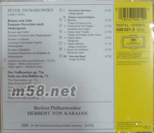 羅密歐與朱莉葉 TCHAIKOVSKY ROMEO AND JULIET(金裝卡拉揚系列)(m58.net) 這套《柴科夫斯基:胡桃夾子組曲 & 羅密歐與朱麗葉》由DG唱片公司發(fā)行于1994年,赫伯特•馮•卡拉揚指揮柏林愛樂樂團演奏錄制,內收錄了柴科夫斯基創(chuàng)作的胡桃夾子組曲和羅密歐與朱麗葉幻想序曲。 柴科夫斯基的《胡桃夾子》為兩幕三場夢幻芭蕾舞劇,作于1892年。劇本是彼季帕根據(jù)恩斯特•霍夫曼的童話《胡桃夾子和鼠王》及大仲馬的改編本寫成的。作者從舞劇中選了六首曲子作為《胡桃夾子組曲》,同年3月7日在一次交響樂演奏會上首演,獲得了巨大的成功。同年12月6日舞劇在彼得堡首演。這部作品是柴科夫斯基三部芭蕾舞劇代表作品之一,也是世界舞蹈舞臺上久演不衰的舞劇精品之一。舞劇《胡桃夾子》的音樂充滿了單純而神秘的神話色彩, 具有強烈的兒童音樂特色。 《羅密歐與朱麗葉》幻想序曲作于1869年,1870和1880年分別進行修訂。這部作品是柴科夫斯基早期的代表作品之一(當時作者只有29歲),也是他流傳最廣泛的作品之一。題材取自莎士比亞的同名悲劇,羅密歐和朱麗葉分別是蒙泰歐和凱普萊特兩大貴族家族的青年男女,雖有勞倫斯神父相助,但終因兩個家族的世仇,導致有情人難成眷屬的悲劇。柴科夫斯基采用著重刻劃悲劇的中心人物的手法,使樂曲成功地體現(xiàn)了戲劇的主題思想。在音樂史中,以《羅密歐與朱麗葉》為題材的音樂作品是非常多的,柴科夫斯基的這部芭蕾音樂便是其中非常成功的一部。 引子的主要主題是一個嚴峻而陰郁的圣詠旋律,概括地揭示出故事的悲劇性。主部主題表現(xiàn)出兩大家族的仇恨和斗爭;副部主題則表現(xiàn)了羅密歐與朱麗葉的愛情;展開部主要表現(xiàn)了兩大家族間的激烈廝殺, 圣詠主題穿插其間,仿佛是勞倫斯神父努力斡旋,力圖使他們放下武器,歸于和解。在樂隊全奏的高潮中,主部主題再現(xiàn),顯示出仇恨已無法消除的悲劇。副部的再現(xiàn)從憂慮、悲哀發(fā)展到幾乎絕望的呼喊,此時已轉化為厄運的象征。幻想序曲的尾聲描繪葬禮的行列,在此背景上出現(xiàn)變形的愛情主題,是對羅密歐和朱麗葉悲痛的回憶,被稱為“我們的愛情”,是人們非常熟悉的歌曲。 赫伯特•馮•卡拉揚(Herbert von Karajan)為偉大的奧地利指揮家。自幼學鋼琴,曾進維也納音樂學校和薩爾茲堡的莫扎特音樂學院學習。他的指揮生涯先從小城烏爾姆開始,1938年被聘為柏林歌劇院的指揮,1947年任維也納愛樂樂團和維也納樂友協(xié)會管弦樂隊指揮,1949年起兼任米蘭•斯卡拉歌劇院常任指揮,1950年兼任倫敦愛樂樂團常任指揮,1955年起任柏林愛樂樂團的終身常任指揮,1956年任維也納國立歌劇院的音樂總指導。他是現(xiàn)代最著名的指揮家之一,人們稱他為“歐洲音樂的總指導”。他也是拜羅伊特、薩爾茲堡音樂節(jié)的主要人物。1967年開始主辦他個人的音樂節(jié)—復活節(jié)音樂周。 卡拉揚的指揮動作灑脫、大方、氣勢磅礴,并以準確和客觀著稱。卡拉揚有驚人的指揮技巧,與樂隊的配合如水乳交融般天衣無縫,通過熱情洋溢、奔放豪邁的演奏,將音樂準確而強有力地傳達給聽眾。他擅長在忠實于原作的基礎上,對作品進行精雕細刻、巧妙布局,甚至適度夸張,而這一切都圍繞著塑造完美的音樂形象而進行。在指揮臺上卡拉揚經(jīng)常閉目深思,使得樂隊各聲部之間達到了演奏室內樂般的默契。在他的領導下,柏林愛樂樂團展現(xiàn)出了一種有如金屬般的亮色,被譽為卡拉揚“音響”。卡拉揚指揮時不僅自己全身心投入音樂之中,而且還善于啟發(fā)樂隊隊員,使他們懂得如何演奏,用魔法般的動作牢牢吸引住樂隊。他所追求的目標就是,“把托斯卡尼尼的精確與富爾特文格勒的幻想結合在一起”。正是他的音樂天賦,加上對樂曲的正確理解和對樂隊的嚴格要求,他的演出總能達到超常出眾的藝術水平。