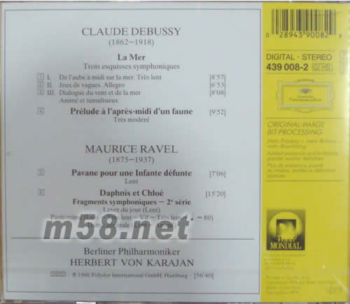DEBUSSY:LA MER 德彪西:大海 金裝卡拉揚系列(m58.net) 交響音畫《大海》(Debussy: La Mer),作于1905年3月,初演于1905年10月。本曲為德彪西最大的一部交響音樂作品,由三個不同內(nèi)容的樂章組成,但每個樂章之間又有內(nèi)在的聯(lián)系,集中起來構(gòu)成一部完整的作品。它表現(xiàn)了“大海”的景色及其富有動態(tài)的性格,并通過整個樂隊的不同音區(qū),極為強烈地表現(xiàn)出“大海”中各種畫面的色彩。樂曲在時間和空間上給人以完整的“海”的印象和對“海”的幻想。新穎的和聲、短小的旋律、豐富的音色、自由的發(fā)展,這些印象派的手法,都生動地刻畫出了一幅幅大海的生動畫面。 全曲分為三大部分:一、《海上的黎明到中午》這一部分順序描寫了大海的潮水聲;夜幕緩慢地揭開,一絲光亮映照在海面上;一輪紅日漸漸升起,天空由紫色變?yōu)榱饲嗌饾u地增加了光輝,一幅開闊的大海黎明景色被生動地描繪出來。二、《波浪的游戲》音樂生動地描繪了白色的浪花拍擊海岸時的情景。導入部描寫了可愛的小波浪來回動蕩的音響。在音樂的繼續(xù)發(fā)展中,英國管奏出可愛的第一個主要動機,給人以幽閑的感覺。三、《風和海的對話》這一部分開始時,定音鼓的震音刻畫出遠方激動、飄浮著的雷聲。之后,音樂描寫了海風吹到海面,引起陣陣騷亂的潮聲,猶如風和海的對話。這部作品不僅描繪出了一幅引人入勝的大海波瀾壯闊的景象,同時也表現(xiàn)出作者對大自然景物的歌頌和贊美。
