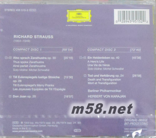 Strauss: Also sprach Zarathustra op.30 Strauss: Till Eulenspiegels lustige Streiche op.28 Strauss: Don Juan op.20 Strauss: Ein Heldenleben op.40 Strauss: Tod und Verklarung op.24 Violin Schwalbe, Michel Conductor Karajan, Herbert von Orchestra Berlin Philharmonic