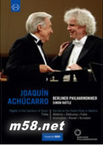 鋼琴:阿丘卡羅 Joaquín Achúcarro 指揮:賽門.拉圖 Sir Simon Rattle 樂團(tuán):柏林愛樂 Berliner Philharmoniker 國際著名西班牙鋼琴家阿丘卡羅(Joaquín Achúcarro)被形容為「當(dāng)代最完美的藝術(shù)家」,過去數(shù)十年來,他的每場(chǎng)音樂會(huì)皆獲得喝采與讚美,他也獲頒許多獎(jiǎng)項(xiàng),包括2000年他被聯(lián)合國教科文組織(UNESCO)選為「和平藝術(shù)家」以彰顯他在音樂上的卓越貢獻(xiàn)。本片分為兩個(gè)部分:其一是阿丘卡羅與柏林愛樂在柏林愛樂廳所演出的的法雅《西班牙花園之夜》;另一是阿丘卡羅在馬德里的鋼琴獨(dú)奏會(huì),曲目以西班牙作曲家的作品為主。 法雅的《西班牙花園之夜》 這首作品原是1909年法雅在巴黎創(chuàng)作的鋼琴夜曲,在西班牙的鋼琴家維涅斯(Ricardo Viñes)的建議下,法雅將夜曲改編成三個(gè)樂章的鋼琴與管弦樂曲。《西班牙花園之夜》是一首印象風(fēng)格濃厚的作品,呈現(xiàn)出西班牙南方的安達(dá)魯西亞風(fēng)光。整首曲子有如一幅幅印象派模糊而優(yōu)美的風(fēng)景畫,描繪著阿拉伯式的阿爾漢布拉宮、吉普賽的異國情調(diào)舞蹈,及絢爛色彩的伊斯蘭式華麗樂舞。1915年法雅將《西班牙花園之夜》獻(xiàn)給維涅斯,隔年在馬德里首演並譜曲出版,成為法雅最受歡迎的代表作之一。 阿丘卡羅 西班牙馬德里皇家劇院的獨(dú)奏會(huì) 第二部份則是鋼琴家阿丘卡羅在馬德里皇家劇院的獨(dú)奏會(huì),曲目包括:鋼琴家魯賓斯坦(Arthur Rubinstein)委託法雅所作的《貝提卡幻想曲》;魯賓斯坦首次在馬德里向觀眾介紹而遭受臺(tái)下聽眾噓聲對(duì)待的拉威爾《高貴與感傷的圓舞曲》;拉威爾因受到貝特朗(Aloysus Bertrand)的詩作〈水妖〉啟發(fā)而譜寫的鋼琴作品《加斯巴之夜》;德布西的《威諾之門》,此曲是因法雅寄給德布西一張上面有威諾之門照片的明信片,而開啟了德布西的想像力;法雅的《向德布西致敬》這首簡(jiǎn)短的曲子里灌注了法雅濃烈的悲傷,做為向德布西最后的告別;葛拉那多斯的《嘆息,瑪哈與夜鶯》是選自《哥雅畫冊(cè)》六首鋼琴小品之一,是描寫一位悲傷的女孩等待著情人回來,但等到的只是夜鶯冷漠的歌曲回應(yīng)。