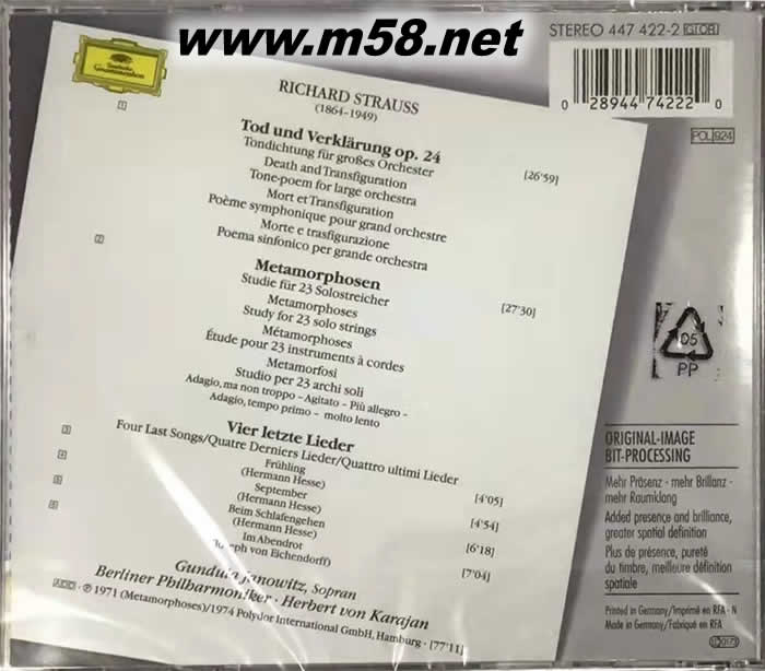 卡拉揚指揮 施特勞斯:最后四首歌 Richard Strauss:Vier letzte Lieder(m58.net) 由女高音昆杜拉?雅諾維茨主唱,赫伯特?馮?卡拉揚指揮柏林愛樂樂團演奏灌錄的《理查德?施特勞斯:最后四首歌》,2009年的《企鵝古典唱片指南》中推薦為三星。 黑塞的詩作被改編成的藝術歌曲,最著名的可能就是施特勞斯的《最后四首歌》。 理查德?施特勞斯的創(chuàng)作生涯自藝術歌曲始,也至藝術歌曲終。6歲時,施特勞斯寫出了第一首圣誕歌曲,到1948年,即他逝世的前一年,理查德?施特勞斯又以著名的《最后四首歌》作為他的終筆之作。 施特勞斯一生鐘情于藝術歌曲的創(chuàng)作,總共寫出了由樂隊或鋼琴伴奏的歌曲200多首。究其原因,大概一方面是出于他對人聲,特寫是女高音與大型樂隊相配合的喜愛,另一方面或許因為他的夫人就是一位歌唱家的緣故。他的藝術歌曲保有了他在歌劇和一些器樂作品創(chuàng)作中的特點,能非常和諧地把高雅情調與瓦格納式的豐富多彩結合在一起,通過旋律賦予歌詞以生命,從而盡顯莊嚴、平和之色。 理查?施特勞斯的《最后四首歌》,創(chuàng)作于作曲家與夫人移居瑞士期間,二戰(zhàn)結束后,理查?施特勞斯由于與納粹的密切關系而離開德國,也許是由于對漂泊生活的失望,他根據(jù)艾興多夫的詩句寫成歌曲《黃昏》,歌中明確表達出了告別幸福生活之感,管弦配樂也引用了早期交響詩《死亡與凈化》中的旋律,聽來令人非常動情。隨后,一本新出版的赫爾曼?黑塞詩集激起了作曲家的創(chuàng)作欲望,他為其中三首詩譜曲寫成《春天》、《九月》和《入睡》,就此完成了自己一生的創(chuàng)作。由女高音與樂隊配合演唱的《最后四首歌》既是施特勞斯畢生辛勤勞動的一個光輝而動人的總結,也是后期浪漫派在音樂藝術風格上的完美體現(xiàn)。 德國女高音歌唱家昆杜拉?雅諾維茨(Gundula Janowitz),從來都不缺乏聽眾,因為她的聲音條件實在是太出眾了。她的嗓音純凈的有點不食人間煙火,并且音色有一種他人難以比擬的銀質般光芒,而演唱時也始終能保持均衡的儀態(tài),長句線條的控制尤為出色。 這套由女高音昆杜拉?雅諾維茨主唱,赫伯特?馮?卡拉揚指揮柏林愛樂樂團演奏錄制的《理查?施特勞斯:最后四首歌》,是備受好評的杰出錄音版本。