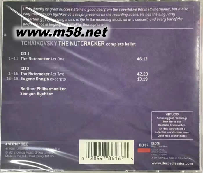 柴可夫斯基:胡桃鉗 Tchaikovsky: The Nutcracke VIRTUOSO大師系列(m58.net) 在柴可夫斯基三大芭蕾舞劇中,《胡桃鉗》是最受到喜愛(ài)的。這齣以小孩為主題的芭蕾舞劇在音樂(lè)、題材和想像力的搭配上,都完美到了極點(diǎn)。作品以霍夫曼所寫(xiě)的多部童話故事為主題改編而成,原本柴可夫斯基並不喜歡這樣的主題,然而一旦著手創(chuàng)作之后,即發(fā)現(xiàn)深深受到吸引,最后他在1892年完成全劇,並於同年12月17日在馬林斯基劇院首演,這齣芭蕾舞劇也成為柴可夫斯基生平最后的重要作品。 專輯指揮畢契柯夫(Semyon Bychkov)於1952年在俄羅斯名城圣彼得堡出生,早年師從圣彼得堡指揮學(xué)派創(chuàng)始人穆辛。1975年移民美國(guó),以出色的才華一鳴驚人,被指揮大師卡拉揚(yáng)收為學(xué)生。1985年1月首度與柏林愛(ài)樂(lè)合作,同年成為布法羅愛(ài)樂(lè)音樂(lè)總監(jiān)。1997年畢契柯夫接任德國(guó)科隆西德廣播交響樂(lè)團(tuán)的首席指揮,1989到2001年接替巴倫波因成為巴黎管弦樂(lè)團(tuán)音樂(lè)總監(jiān)。另外也曾擔(dān)任圣彼得堡愛(ài)樂(lè)和德勒斯登國(guó)立歌劇院之首席指揮。2010年以華格納歌劇《羅恩格林》錄音獲得BBC音樂(lè)雜誌(BBC Music Magazine)年度唱片之殊榮。BBC音樂(lè)雜誌表示:「這次受到提名的十八張唱片皆相當(dāng)優(yōu)異,每一張都有獲得『年度唱片』的資格,但我們很高興這次最后獎(jiǎng)落畢契柯夫,他是當(dāng)代最棒的音樂(lè)家之一。」 晚年的卡拉揚(yáng)曾經(jīng)有一次接受採(cǎi)訪,記者問(wèn)有誰(shuí)能繼承他的音樂(lè)寶座,繼續(xù)統(tǒng)領(lǐng)柏林愛(ài)樂(lè),卡拉揚(yáng)列舉了兩、三個(gè)名字,認(rèn)為他們能在藝術(shù)上有足夠造詣,其中除了阿巴多,另一個(gè)便是畢契柯夫。 畢契柯夫與柏林愛(ài)樂(lè)錄製的《胡桃鉗》是一份非常輕鬆有趣的演出,樂(lè)評(píng)對(duì)畢契柯夫指揮的柴可夫斯基作品一向讚譽(yù)有加。儘管他的音樂(lè)早已融入西方主流品味,但其俄羅斯風(fēng)格依舊渾然天成。他表示:「其實(shí)我就是一個(gè)挺復(fù)雜的音樂(lè)人,出生在俄國(guó)、國(guó)籍是美國(guó)、現(xiàn)居法國(guó),又指揮著德國(guó)樂(lè)團(tuán),這也許正促成了我指揮的風(fēng)格吧。」其音樂(lè)的內(nèi)在張力與壯闊結(jié)構(gòu),在當(dāng)今大師屈指可數(shù)的年代更顯得鳳毛麟角,彌足珍貴。