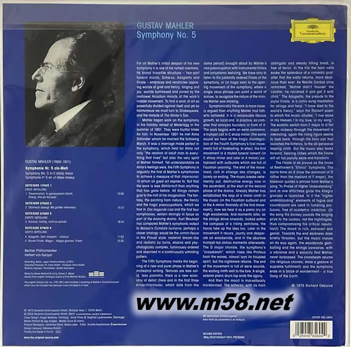 卡拉揚(yáng)指揮 馬勒Mahler: Sinfonie Nr. 5 雙黑膠 藍(lán)膠(DG唱片125周年紀(jì)念版)專輯背面圖片