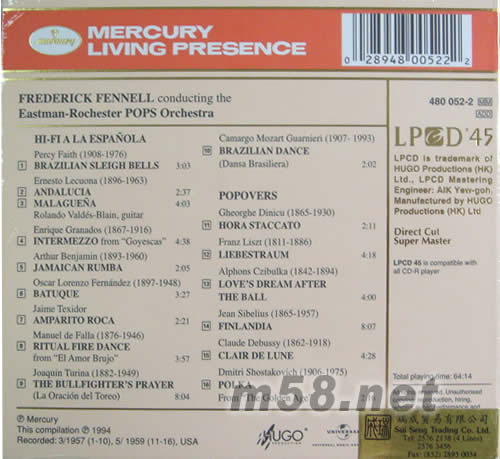Hi-Fi A La Espanola AND Popovers LPCD(m58.net) 這是被稱為錄音史上奇跡的另一名盤--hifi西班牙,錄音使用三個201德律豐根麥克風錄制,有些使用一個201,兩個M56德律豐根麥克豐錄制,錄制在半英寸,3 track的母帶上,舞臺感深闊穩定。此碟收錄許多西班牙民族風格曲目,無論您收集過哪一張西班牙音樂碟,都可以在里面找到它的影子。西班牙的音樂,沒有太過深邃的思考,沒有大喜大悲地展示內心,它更多的是展現生活,那種火辣辣的熱情生活,和由此衍生的對自己民族和故鄉的自豪感。每次聽到這樣的音樂,總能得到夢想中的精神家園:夕陽斜照的小鎮,炎熱夏季月光如水的傍晚,熱情似火歡歌載舞的人群,好象還能嗅到烹煮食品的炊煙。而這些質樸的生活感覺,用Mecury這樣的錄音風格來表現再好不過:它不是綾羅綢緞,而是亞麻;它不是金雕玉琢的宮殿,而是毫無修飾的大理石或木頭起的房子。你會覺得它更真實一些。(