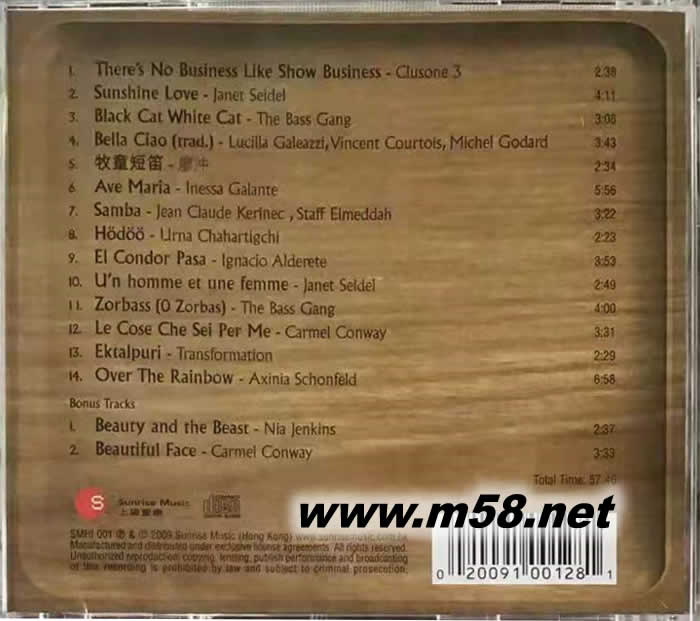 01. There’s No Business Like Show Business – Clusone 3 02. Sunshine Love – Janet Seidel 03. Black Cat Whit Cat - 牛筋四人幫The Bass Gang 04. Bella Ciao (trad.) - Lucilla Galeazzi, Vincent Courtois, Michel Godard 05. 牧童短笛 - 廖沖 06. Ave Maria - 嘉蘭特 Inessa Galante 07. Samba - Jean Claude Kerinec , Staff Elmeddah 08. Hödöö - 烏仁娜 Urna Chahartigchi 09. El Condor Pasa - Ignacio Alderete 10. U’n home et une femme - Janet Seidel 11. Zorbass (0 Zorbas) - 牛筋四人幫The Bass Gang 12. Le Cose Che Sei Per Me - 卡蜜兒 Carmel Conway 13. Ektalpuri – Transformation 14. Over The Rainbow - 辛妮亞 Axinia Schonfeld Bonus Track: 1. Beauty and the Beast - Nia Jenkins 2. Beautiful Face - 卡蜜兒 Carmel Conway