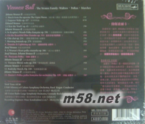 勁爆波爾卡Viennese Ball(m58.net) Artist: Gennady. Rozhdestvensky & Pavel Kogan Conductor Details: 本專輯收錄了史特勞斯家族三位主要成員膾炙人口的作品,包括:雷鳴與閃電、撥奏波爾卡、藍色多瑙河、皇帝圓舞曲、查德斯基進行曲… 等13首經典鉅作。 配以真槍實炮,音場動態驚人,另穿插出其不意的音效,讓發燒程度無限升級。俄羅斯原裝進口,發燒友收藏必選! 波爾卡: 是一種舞蹈的音樂,源於19世紀中期的波希米亞,是捷克人民歌音樂,在歐洲美洲等地流行。在古典音樂中,最為人熟悉的波卡舞曲多數為老約翰·史特勞斯及其子輩們創作的。 享有「音樂之都」美稱的維也納自廿世紀初開始,每年元旦都會在「維也納金色大廳」舉行「維也納新年音樂會」。演出曲目多以「 波爾卡舞曲、圓舞曲、進行曲」等為主,期以歡愉的氣氛來迎接新的一年的來臨。