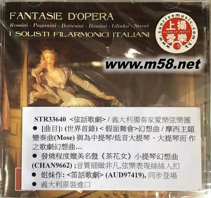 Fantasie d'Opera 弦話歌劇(m58.net) 發(fā)燒程度媲美試機名盤《茶花女》小提琴幻想曲(Chandos CHAN9662) 曲目特別收錄(世界首錄)< 假面舞會>幻想曲, 摩西主題變奏曲(Mose) 與為中提琴/低音大提琴/大提琴而 作之歌劇弦樂幻想曲… 音質(zhì)細(xì)致非凡,弦樂表現(xiàn)絲絲入扣; 意大利原裝進(jìn)口