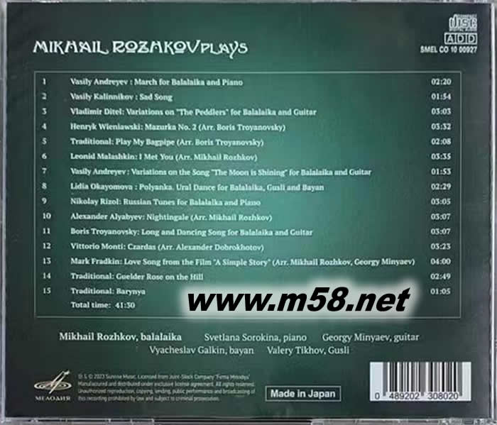 Mikhail Rozhkov plays 魔指 俄羅斯三角琴(m58.net) 獲指揮帝王卡拉揚譽為“巴拉萊卡帕格尼尼亅 精彩演繹15首古今名曲, 包括俄羅斯傳統民謠、情歌、古典; 琴藝之高超, 令人瞠“耳”結舌 特別推介: T#12<查爾達斯(Czardas) 狂想曲> 俄羅斯源音母帶無壓縮輸出、低音染,原味十足!! 演奏家Mikhail Rozhkov/羅茲科夫 (1918 - 2018,終年99歲),被指揮家卡拉揚譽為“巴拉萊卡琴界帕格尼尼” 私房推介曲: Track#12:古典名曲<查爾達斯狂想曲(Czardas)> Track#13:電影“A Simple story”插曲情歌(初聽此曲,直覺是:咦!?這不正是中國知名唱作人 李健 的神曲"貝加爾湖畔"的濫觴嗎?) 【Melodiya X Obsession系列📀巴拉萊卡琴界帕格尼尼 - Mikhail Rozhkov】巴拉萊卡琴是俄羅斯傳統音樂中必會出現的樂器,琴身呈三角形,有不同的大小以定音域,琴頸幼,有三弦,先天的外形優勢方便演奏者彈撥迅速的旋律。獨特的聲音成為了俄羅斯音樂的標志。Melodiya X Obsession系列這次迎來巴拉萊卡琴國寶級的演奏家 - Mikhail Rozhkov羅茲科夫 (1918 - 2018) ,說他是國寶級最適合不過,多次國家授勳,1994年封他為人民藝術家,指揮家卡拉揚更給他“巴拉萊卡琴界帕格尼尼”的美譽。他的琴技超然,令人嘩然的“摩打手”是他的強項,而我們聽他的音樂不止有欣賞技巧,也能從中了解當時蘇俄的人民情懷,悲喜交雜,五味雜陳。羅茲科夫的音樂也出現在多部著名電影之中: 戰爭與和平 (1956)、這裡的黎明靜悄悄(The Dawns Here Are Quiet, 1972)、普通的故事 (1978)...當然還有2006年名導演Vyacheslav Orekhov為他執導的紀錄片電影Life is Beautiful。此專輯收錄多首古典、民樂名曲包括: 波利安卡舞曲、夜鶯、查爾達斯、巴瑞娜等等。鋼琴、吉他、巴揚手風琴、古斯里琴伴奏,精彩絕倫! 過往只推出過黑膠唱片,絕版多時,現推出限量日本壓碟CD,全球獨家發行‼