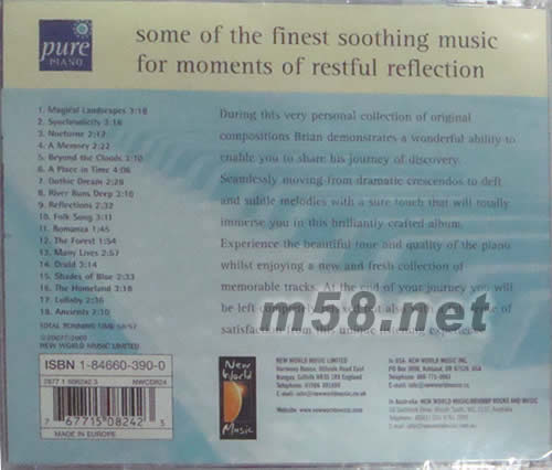 純鋼琴之音 PURE(m58.net) 純鋼琴之音 由英加 New world 公司旗下的鋼琴及制作家Brian king 親自編作及演奏18首聽郵耳油的鋼琴作品,首首觸動心靈,這是張可把心靈釋放的最佳音樂選擇 !