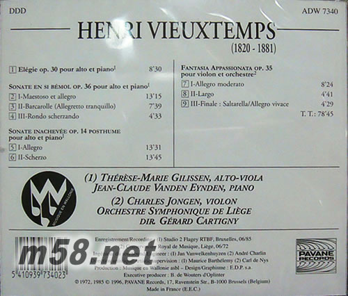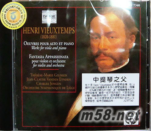 中提琴之父(m58.net) Henri Vieuxtemps(1820-1881)比利時的小提琴家及作曲家,師事雷克洛斯、迪瓊克、白里奧等三位,14歲在維也納獨奏貝多芬小提琴協奏曲一鳴驚人,1835年師事雷恰后逐展開歐洲表演,他的作品是學習小提琴的示范教本,又吸收蘇俄小提琴樂派的精華,成為舉世聞名之大師,主掌法比小提琴樂派。本片的哀歌、奏鳴曲等為中提琴及小提琴曲,都是市上少見,旋律美好、精致優美的曲目,第四首加上小提琴及管弦樂的幻想曲,聲勢浩大,琴聲感人的至佳名曲。