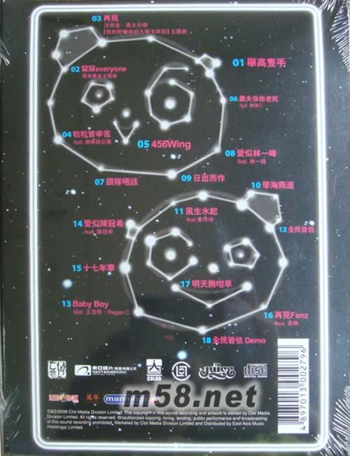01. 舉高雙手 02. 冧冧Everyone 萬寧廣告主題曲 03. 再見 汪明荃.農(nóng)夫合唱[我的野蠻奶奶大戰(zhàn)戈師奶]主題曲 04. 粒粒皆辛苦 feat.咖啡因公園 05. 456Wing 06. 農(nóng)夫系你老死 feat.陳負仁 07. 跟隊唔該 08. 愛似林一峰 feat.林一峰 09. 日出而作 10. 學海無涯 11. 風生水起 feat.麥玲玲 12. 全民皆估 13. Baby Boy feat.王浩信 Regen C 14. 愛似陳冠希 feat.陳冠希 15. 十七年華 16. 再見Fanz feat.嘉琳 17. 明天無甘早 18. 全民皆估 Demo