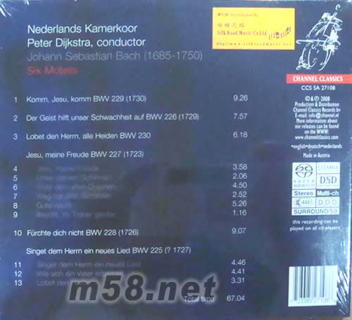巴哈神圣的六首 經(jīng)文歌SACD(m58.net) 荷蘭新一代指揮家迪克斯塔.興與多個歐洲極負盛名的合唱團合作演出,其中他創(chuàng)辦的<<紳士男聲合唱團>>更令他蜚聲國際,這次他拍著名荷蘭室樂合唱團演繹巨匠音樂家巴哈"經(jīng)文歌BWV225-230".迪克斯塔揮灑自如,合唱團在他的指揮下發(fā)揮得超越水準,兩者互相輝映,配合SACD的混音處理效果理能細聽對上帝的贊訟,深深感受每首經(jīng)文中的意思.