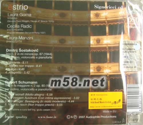ESTRIO肖斯塔科維奇及舒曼鋼琴三重奏(鋼琴、小提琴、大提琴)(m58.net) Laura Gorna (小提琴) Cecilia Radic (大提琴) Laura Manzini (鋼琴) 紅遍歐洲各地的三重奏女子組合.她拉的演奏充滿默契,完美無暇盡頭對(duì)音樂充滿熱誠,困而深受樂迷擁戴.首次與名錄音師里奇抄手合作.包括演繹[肖斯塔科維奇的F小調(diào)第2號(hào)鋼琴三重奏作品67.]和[舒曼F大調(diào)第2號(hào)鋼琴三重奏作品80']等,經(jīng)里奇精心監(jiān)制,配合優(yōu)美典雅的演奏,將樂曲達(dá)至最完美的復(fù)現(xiàn).