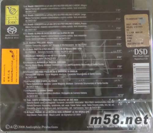 FONE 25周年日本限量版SACD(m58.net) 為慶祝<豐力(Fone)>創立25週年特別推出的發燒精選集,由名錄音師里奇(Giulio Cesare Ricci)監制精心挑選13首最精彩、最具質素的古典樂曲,包括維瓦爾迪(Antonio Vivaldi)的[小提琴及弦樂小調協奏曲作品3第9(Concerto in La min op.3 n.9 per Violino e arch)]、[“榮耀” RV 589(dal Glovia RV 589)]、巴哈(J.S.Bach)的[D小調”為小提琴獨奏而作的組曲”BWV1004(Partita II per violino solo in re mineore BWV1004)]、皮亞佐拉(A.Piazzolla)的[華麗的探戈(La Grand Tango)]、羅西尼(G.Rossini)的[塞維利亞理髮師交響曲(II Barbiere di Siviglia, sinfonia)]、普契尼(G.Puccini)的歌劇作品《托斯卡(Tosca)》裡的詠嘆調[為了藝術,為了愛(Vissi D’Arte)]及莫扎特(W.A.Mozart)的[A小調鋼琴迴旋曲K511(Piano Rondo in A minor KV511)]等,加上里奇精心監制,達致頂級的製作天碟,無可匹敵!