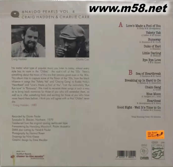 模擬的魅力「黑珍珠」系列第四輯 Analog Pearls Vol. 4 [Old Gold] Craig Hadden & Charlie Carr 黑膠(m58.net) Craig Hadden (男聲)、Charlie Carr (男聲) 1. 上世紀(jì)六、七十年代流行樂壇實力派歌手克雷格‧哈登(Craig Hadden)以擅長演唱長青經(jīng)典流行曲而備受當(dāng)時特別在歐洲的樂迷歡迎,他的演唱風(fēng)格是正宗的《樂與怒(rock 'n roll)》,加以他的聲線清脆悅耳,演繹這些歌曲別具韻味。