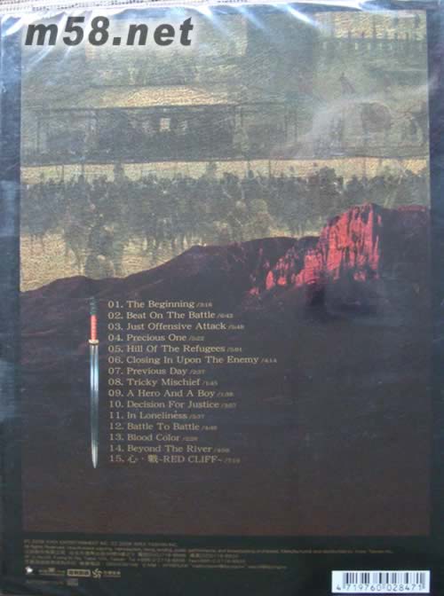 赤壁電影原聲碟(臺灣版)(m58.net) 2008年最受矚目的歷史大劇【赤壁】,是國際大導演吳宇森重返華語影壇后首度執導的鉅作。 在【赤壁】片中,集合了中港臺日四地最頂尖的演員,將波瀾壯闊的三國史詩故事搬上銀幕,為了讓電影中的畫面有最佳的搭配,吳宇森導演特別商請日本國際級音樂人巖代太郎(Taro Iwashiro)為【赤壁】量身打造配樂,即將於7/25發行的【赤壁 電影原聲帶】中,除了完整收錄配樂外,還收錄了【赤壁】唯一中文主題曲【心?戰 ~RED CLIFF~】。這首【心?戰 ~RED CLIFF~】由音樂新歌姬alan演唱,是日本配樂大師巖代太郎與華語樂壇寫詞舵手李焯雄共同創作,兼具磅礡與細膩的演唱極為撼動人心,勢必成為又一首令人永遠難忘的經典歌曲!