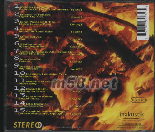1.MIKLOS ROZSA: PARADE OF THE CHARIOTEERS 2.FRIEND'N FELLOW: LIGHT MY FIRE 3.JOHN PIZZARELLI TRIO: I LIKE JERSEY BEST 4.RACHEL Z: MOON IN YOUR HAIR 5.MIKE SILVER YOU 6.GJALLARHORN: HJAONINGARIMA 7.CORYELL,ASSAD,ABERCROMBIE: AFTER THE RAIN 8.ANA CARAM: ESTATE 9.VIENNA TENG: MY MEDEA 10.JACQUES LOUSSIER TRIO: ARABESQUE 11.NATALIE MERCHANT: DIVER BOY 12.DAVID ROTH: RISING IN LOVE 13.JOACHIM KUHN: ANGEL DUST 14.LILA DOWNS: LA CUCARACHA 15.CAMILLE SAINT-SAENS: DANSE MACABRE,OP.40