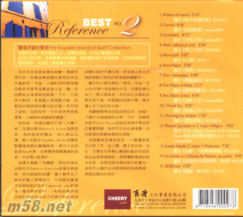 靈魂深處的聲音 BEST 2(m58.net) 您是否也有過這樣的經驗,隨著時間不同,聆聽音樂的合適類型似乎也不盡相同。早晨,小編制的阿雷格雷四重奏中提琴溫馨浪漫小品,讓一天的開始充滿清新的舒適;下午,可能來杯咖啡,伴著爵士樂香醇入喉,為緊張的情緒提供壓力的舒緩。然而到了夜晚,回到家中,今天忽然想來點激情,大編制的場面絕對震撼! 說到這,您還想聽些什么?人聲?有!英國女歌手Bonnie Koloc溫暖甜美,清新脫俗的嗓音,叫人難以忘懷。爵士女歌手Tokunbo Akinro那種帶點靈魂唱腔的慵懶節奏,彈力十足的低音Bass伴奏,仿佛置身煙霧彌漫的酒吧,不禁想小酌兩杯。 著還不夠嗎?沒關系,再為您端出吉他天王Antonio Forcione這道菜夠嗆吧,熱力四射的氛圍,讓人幾乎忘了喘息的驚人彈奏技巧,只怕聽完會情不自禁的起立鼓掌!absolute zero的演奏,電貝司的音符, 一粒粒的像是甩出來打到地放又跳了好幾下般的要跳出喇叭般的下鉆力道,更是使人無法克制跟著腳打節拍的無意識肢體動作。 醫生詩人陳克華的凝視作品,在2006年發行時話題性十足,也讓音樂沾染了一點文學氣息,其中與之合唱的女歌手林千惠,所展露的音樂才華,幾乎讓人忘了她只有16歲。 再聽聽豎琴與長笛的對話吧,舒緩一下剛才太過激情的心情,不然,居爾特女歌手Anne Bryony的親切清澈中帶有些許憂郁歌聲,油然而生是、的浪漫情懷,仿佛停留在無憂無慮的回憶里。 想要擁有這樣的享受,CD數量需要不少吧?不,從人聲,爵士到古典,流行。巨禮文化所精心嚴選的曲目全部收錄在這張精選里頭,想要體驗優異的錄音效果,想要認識音樂的無形影響力,這張可以讓您從早聽到晚的發燒精選,絕對是最快的途徑。