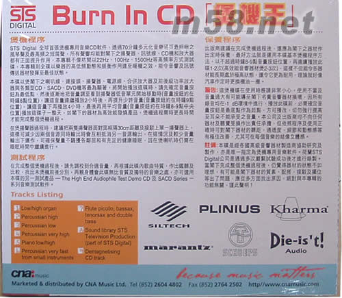 煲機王(藍色封面)(m58.net) 煲機王」是一張專為音響器材度身泡製的 「工具碟」,全碟74分多鐘收錄共9 Track,前6而ack是純樂聲,包括管風琴、敲擊樂、鋼琴,以至笛子、昔士風……等等。其中 Track3鼓聲效果比 「打斷鼓棍」更精彩,整套drum Set盡現(xiàn)跟前,而Track8是一段8分幾的STS「招牌聲效集」,「飛機大炮打樁」等過癮爆棚聲共冶一爐。播畢此碟,相信任何機都熟了九成!