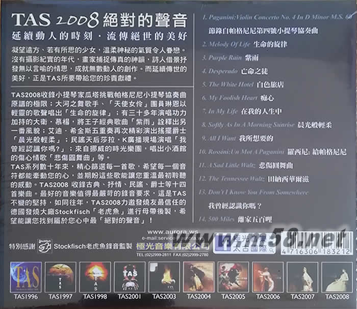TAS 絕對的聲音CD 2008 鬼斧神功(m58.net) 挑戰(zhàn)最挑剔的耳朵 延續(xù)動(dòng)人的時(shí)刻.流傳絕世的美好 凝望遠(yuǎn)方、若有所思的少女,溫柔神秘的氣質(zhì)令人眷戀。沒有攝影紀(jì)實(shí)的年代,畫家捕捉傳真的神韻,詩人借景抒發(fā)無以言喻的情思,成就無數(shù)動(dòng)人的創(chuàng)作。而延續(xù)傳世的美好,正是TAS所要帶給您的珍貴獻(xiàn)禮。 TAS2008收錄小提琴家瓜塔挑戰(zhàn)帕格尼尼小提琴協(xié)奏曲原譜的極限;大河之舞歌手、「天使女伶」樂團(tuán)員琳恩以輕靈的歌聲唱出「生命的旋律」;有三十多年演唱功力加持的大衛(wèi)‧慕楊,將王子經(jīng)典歌曲「紫雨」詮釋出另一番風(fēng)貌;艾迪.希金斯五重奏再次精彩演出搖擺爵士「晨光般輕柔」;民謠天后莎拉‧K廣播現(xiàn)場演唱「我曾經(jīng)認(rèn)識你嗎?」;來自挪威的時(shí)光樂團(tuán),唱出小酒館的傷心情歌「悲傷圓舞曲」等。 TAS系列數(shù)十年來,嚴(yán)苛的篩選每一首歌,希望每一個(gè)音符都能夠牽動(dòng)您的心,并期盼這些歌能讓您重溫最初聆聽的感動(dòng)。TAS2008 收錄古典、抒情、民謠、爵士等十四首樂曲。最好的音樂值得最嚴(yán)苛的錄音要求,這是TAS不變的堅(jiān)持,如同往年,TAS2008力邀發(fā)燒友最信任的德國發(fā)燒大廠Stockfisch「老虎魚」進(jìn)行母帶后製,希望能讓您找到屬于您心中最「絕對的聲音」!