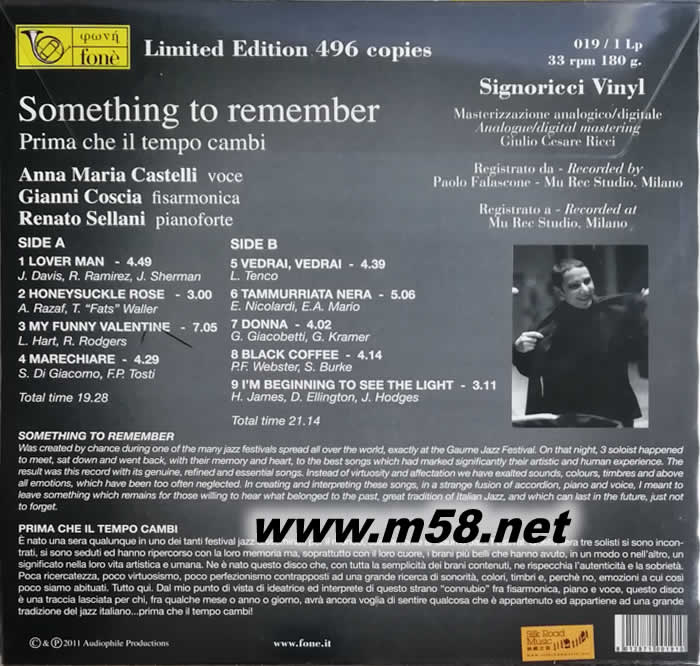 爵士女伶 FONE絲泰莉/塞蘭尼/科斯雅 往昔情懷Something To Remember 黑膠 限量版(m58.net) 安娜.瑪麗雅.卡絲泰莉(Anna Maria Castelli)是意大利當(dāng)今首屈一指的爵士樂(lè)的唱作人(singer-song-writer),她擁有成熟而優(yōu)雅的聲線,歌唱技巧出眾,加上她橫溢的音樂(lè)創(chuàng)作才華,使她成為歐洲最炙手可熱的爵士樂(lè)女歌手。她亦是一位出色的女演員,因此在演唱時(shí)感情非常投入,表情十足,每首歌曲都才情並茂,是她備受歡迎的原因之一。她伙拍意大利爵士樂(lè)殿堂級(jí)鋼琴演奏家雷納托‧塞蘭尼(Renato Sellani)及手風(fēng)琴演奏家詹尼‧科斯雅(Gianni Coscia),配合錄音大師里玆(Giulio Cesare Ricci)以最精巧的器材及其高超的錄音技術(shù)錄製令樂(lè)迷振奮的專輯【往昔情懷】,數(shù)位名家全情演繹多首昔日經(jīng)典名曲包括【Lover Man(情人)】、【My Funny Valentine(我的有趣情人)】,【Yesterdays(舊日)】、【Donna(唐娜)】、【W(wǎng)hen I Fall In Love(當(dāng)我墮入情網(wǎng))】、【Black Coffee(黑咖啡)】、【I’m Beginning To See The Light(我開始看見光線)】和【He’s Got The Whole World In His Hands(整個(gè)世界在他手中)】,他們互展所長(zhǎng),使出渾身解數(shù),將歌曲以最完美恣態(tài)呈顯,加上里玆過(guò)人的錄音功力, 美樂(lè)透過(guò)完美的音效, 分別以24K金碟 與及 180克33轉(zhuǎn)處女雙碟裝黑膠唱片為載體, 全球限量 496張,更具現(xiàn)場(chǎng)的真實(shí)體驗(yàn),營(yíng)造出絕世的鑑聽珍盤。
