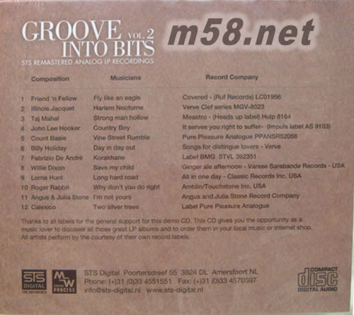 GROOVE INTO BITS VOL.2(m58.net) STS Digital 與一間擁有三十年製作喇叭經(jīng)驗(yàn)的德國高級(jí)音響工廠Blumenhofer Acoustics合作推出測試專集Groove into bits vol.2 (美妙一刻 2),12首作品,來自不同唱片公司,但相同的是全數(shù)從黑膠唱片抽出音軌,對(duì)!真是由一張又一張黑膠唱片中抽出音軌製作,目的是保留唱片音槽播放之動(dòng)人美妙一刻,更是Blumenhofer Acoustics測試軟件。
