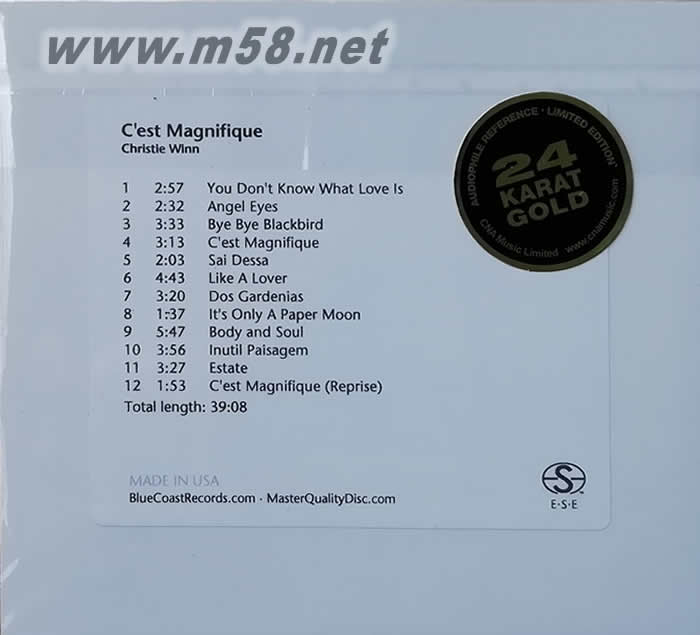 CHRISTIE WINN C’EST MAGNIFIQUE (實在精彩)藍岸精選系列 MQDCD(m58.net) 如絲絹的光澤,不耀眼,只感覺是順滑的歌聲,C’est Magnifique MQD (實在精彩) 母盤直錄,是鋼琴手Christie Winn第一張自彈自唱專輯,那爵士樂手法,如泣如訴,情感傾瀉而下之唱腔,沒道理不自覺投入當中的音樂起伏,實在精彩。