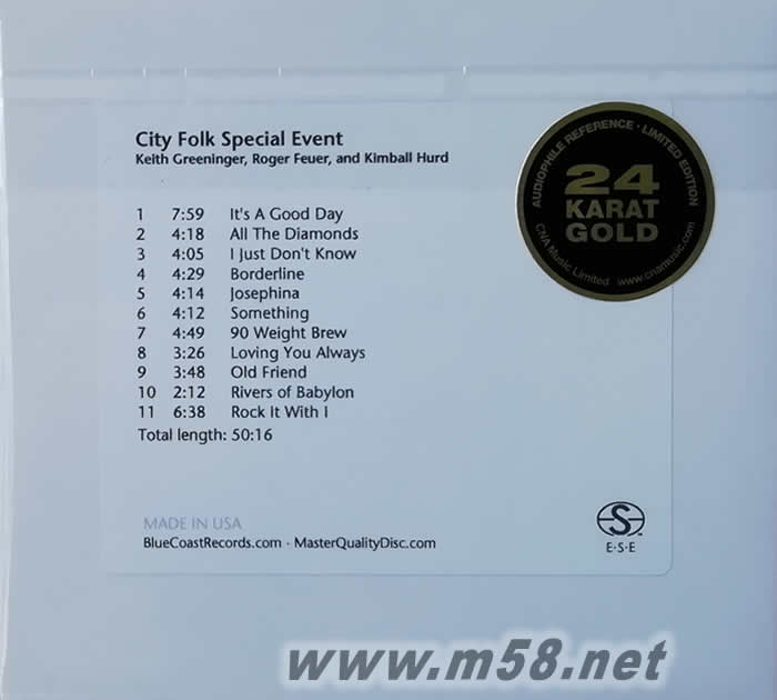 KEITH GREENINGER CITY FOLK - SPECIAL EVENT 18 MARCH 2012 MQD (城市民歌)藍岸精選系列 MQDCD(m58.net) MQD - Master Quality Disc 24K Gold CD You won't be able to make a better sounding CD of these songs. Blue Coast Records (藍岸唱片) 首次推出,從錄音室母盤抽取數(shù)據(jù),復(fù)製至自家專利開發(fā)之24K金碟,多款母盤直刻MQD - Master Quality Disc,每張藍岸直刻MQD均有簽名,第幾張直刻號碼,歌曲目錄指引(Table of Contents (TOC) including Track Listing and Runtimes)。 Master Quality Discs were designed and tested to our rigorous specifications. We replicate each disc in our studios by hand, at optimized speeds from the master sequence. These are of master quality directly from the original sequence. MQD 24K Gold CDs are of archival quality and meant to last hundreds of years. Produced by Cookie Marenco Keith Greeninger: Vocals, Guitar Kimball Hurd: Vocals, Guitar, Mandolin, Banjo Roger Feuer: Vocals, Guitar Recorded, Remixed and Mastered by Cookie Marenco 藍岸唱片公司王牌結(jié)他男歌手Keith Greeninger聯(lián)同兩位結(jié)他好友,製作出這張不可多得民歌作品,三位大男人,三種不同腔調(diào),帶出多種溫暖,觸碰心靈深處,City Folk - Special Event 18 March 2012 MQD (城市民歌)母盤直錄專輯,是男聲與結(jié)他天碟。