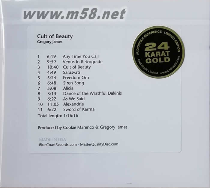 GREGORY JAMES & KAI ECKHARDT CULT OF BEAUTY (至愛美麗)藍岸精選系列 MQDCD(m58.net) 美國電結他手Gregory James第9張作品 - Cult of Beauty MQD(至愛美麗) 母盤直錄,這位在1952出生的前輩,身長在被稱為娛樂工業的黃金年代,電視臺及電臺的綜藝節目和音樂播放,影響他至深,結他手法是流行為主,強勁及帶有濃烈情感,只是幾條吉他線那么簡單,直接不作修飾的真摰旋律。
