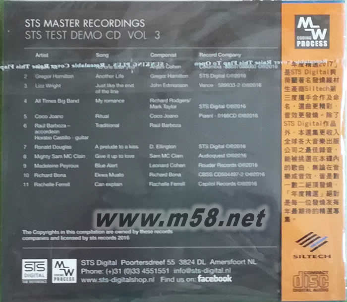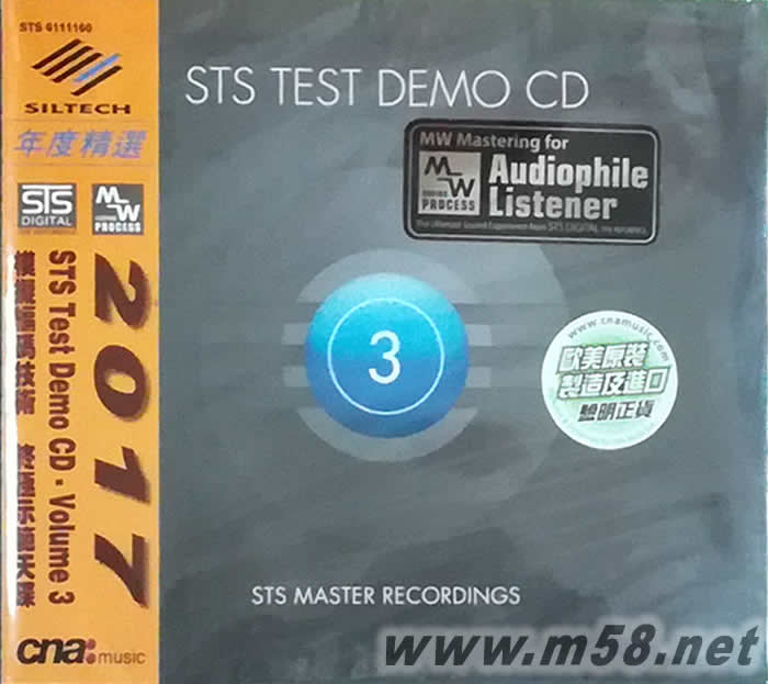 STS TEST DEMO CD VOL.3 (年度精選 2017)(m58.net) 「年度精選2017」是STS Digital與荷蘭著名發(fā)燒線材生產(chǎn)商Siltech第三度攜手合作及命名,選曲更精彩,音效更發(fā)燒。除了STS Digital作品外,本選集更收入全球各大音樂(lè)出版公司之最佳錄音,能被挑選在本碟內(nèi)的歌曲,無(wú)論在音樂(lè)或音效,皆是數(shù)一數(shù)二絕頂發(fā)燒,「年度精選」絕對(duì)是每一位發(fā)燒友每年最期待的精選專(zhuān)集。