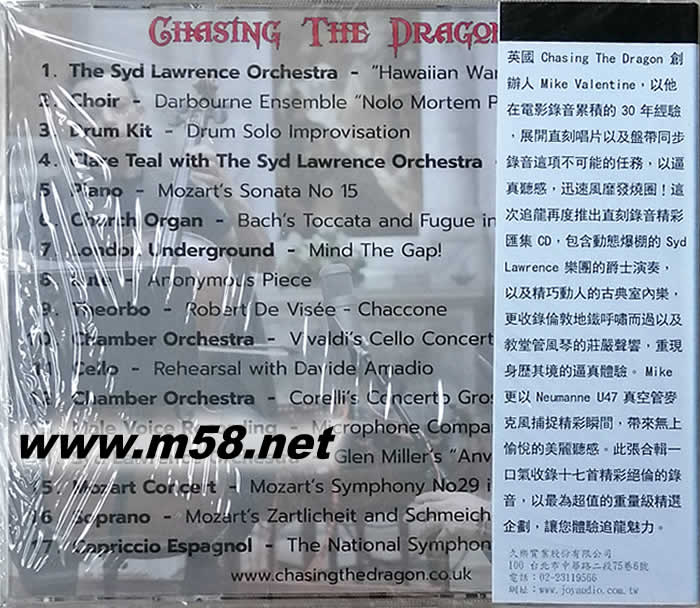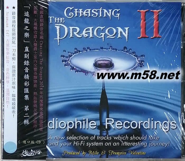 追龍之樂CHASING THE DRAGON 2 - 滴水 2 直刻CD(m58.net) 英國直刻錄音名廠二次帶來重磅級超值鉅獻,大規模收錄人聲爵士室內交響各類樂曲! ★ 錄音過程從頭到尾一刀未剪,臨場感破表! ★ Neumann U47 古董管麥拾音,音色醇厚! 英國 Chasing The Dragon 追龍之樂絕對是近年來最受人矚目的發燒傳奇。創辦人 Mike Valentine 以他在電影錄音累積的 30 年經驗,破天荒展開直刻唱片以及盤帶同步錄音這項不可能的任務。因為直刻唱片不經混音處理,數量稀少,而聽感逼真,讓追龍迅速風靡世界! 這次追龍再度推出直刻錄音精彩匯集CD,以饗樂迷。本片收錄場面熱烈、動態爆棚的 Syd Lawrence 樂團的爵士演奏,以及精巧動人的古典室內樂,一刀未剪,帶來一鏡到底的暢快,更收錄倫敦地鐵呼嘯而過以及教堂管風琴的莊嚴聲響,重現身歷其境的逼真體驗。 Mike 更以 Neumanne U47 真空管麥克風捕捉精彩瞬間,帶來無上愉悅的美麗聽感。此張合輯一口氣收錄十七首精彩絕倫的錄音,以最為超值的重量級精選企劃,讓您體驗追龍錄音無可取代的快感。