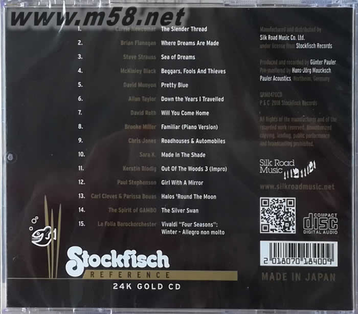 1. 錄音界巨擘「老虎魚」以顯赫的專業(yè)錄音技術,精挑擁有優(yōu)美聲線的歌手和音樂造詣極高的唱作人、樂隊和樂團合作而在樂壇奠定崇高地位,他們制作的每一個專輯多具備個別特色、風格與吸引力,展現聲音的最美境界,不少「發(fā)燒」樂迷對其錄音制作趨之若鶩。 2. 最新專輯«「老虎魚」:黃金標準(Stockfisch Reference)»收錄了旗下不同時期的十五位歌手和樂團最具代表性的專輯主題歌曲,亦是他們與廠牌的標志性錄音制作,無論是音樂藝術或是音效技術皆是上乘之作,欣賞價值極高。 3. 被挑選的每一首歌曲包括民謠、情歌、爵士樂和古典樂,各具特色,雖然風格䢛異,但所有樂曲皆能將來自四方八面的音響源、音樂和歌聲的位置和種類清清楚楚地展現。樂曲本身的旋律優(yōu)美流暢,加上歌手與樂手門出色的表現,此専輯除了可用作測試音響系統(tǒng)各種不同的作用和能力表現外,亦是欣賞美樂的最佳選擇之一。 4. 專輯以在日本制造的24K金CD為載體,歌聲與樂器聲顯得更為純凈自然,音質渾厚清晰,音色、音場和音效更臻完美,是精雕細琢的示范名盤。