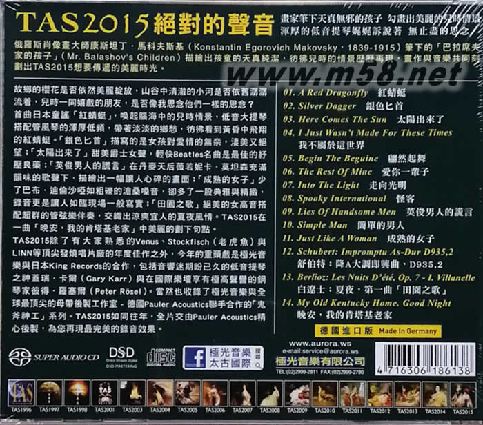 TAS 絕對的聲音SACD 2015 鬼斧神功(m58.net) 畫家筆下天真無邪的孩子 勾畫出美麗的兒時情景 渾厚的低音提琴娓娓訴說著 無止盡的思念 俄羅斯肖像畫大師康斯坦丁.馬科夫斯基(Konstantin Egorovich Makovsky,1839-1915)筆下的「巴拉席夫家的孩子」(Mr. Balashov’s Children)描繪出孩童的天真純潔,彷彿兒時的情景歷歷再現,畫作與音樂共同刻劃出TAS2015想要傳遞的美麗時光。 故鄉的櫻花是否依然美麗綻放,山谷中清澈的小河是否依舊潺潺流著,兒時一同嬉戲的朋友,是否像我思念他們一樣的思念? 首曲日本童謠「紅蜻蜓」,喚起腦海中的兒時情景,低音大提琴搭配管風琴的渾厚低頻,帶著淡淡的鄉愁,彷彿看到黃昏中飛翔的紅蜻蜓。「銀色匕首」描寫的是女孩對愛情的無奈,淒美又絕望;「太陽出來了」甜美爵士女聲,輕快Beatles名曲是最佳的紓壓良藥;「英俊男人的謊言」在丹麥天后薇若妮卡.莫坦森充滿韻味的歌聲下,描繪出一幅讓人心碎的畫面;「成熟的女子」少了巴布.迪倫沙啞如粗礫的滄桑嗓音,卻多了一股典雅與精致,錄音更是讓人如臨現場一般寫實;「田園之歌」絕美的女高音搭配超群的管弦樂伴奏,交織出涼爽宜人的夏夜風情。TAS2015在一曲「晚安,我的肯塔基老家」中美麗的劃下句點。 TAS2015除了有大家熟悉的Venus、Stockfisch(老虎魚)與LINN等頂尖發燒唱片廠的年度佳作之外,今年的重頭戲是極光音樂與日本King Records的合作,包括音響迷期盼已久的低音提琴之神蓋瑞.卡爾(Gary Karr)與在國際樂壇享有極高聲譽的鋼琴家彼得.羅塞爾(Peter Rösel)。當然也收錄了極光音樂與全球最頂尖的母帶后製工作室-德國Pauler Acoustics聯手合作的「鬼斧神工」系列。TAS2015如同往年,全片交由Pauler Acoustics精心后製,為您再現最完美的錄音效果。