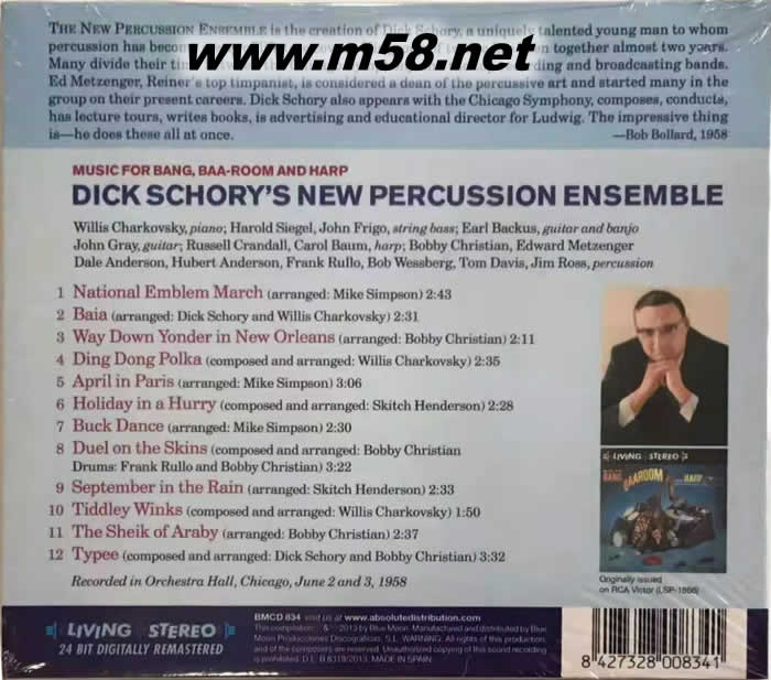 敲擊之王 Music for Bang Baa Room and Harp 立體聲名盤(TAS專業(yè)推介發(fā)燒名盤)(m58.net) Dick Schory – Music for Bang, Baa-Room and Harp (敲擊之王) TAS上榜名盤,更是最佳流行作品十大之一,與Casino Royale、Belafonte at Carnegie Hall、Dark side of the Moon等等齊名。Dick Schory被稱謂敲擊之王,實至名歸、當之無愧。他首先是一個敲擊樂手,后與芝加哥交響樂團合作,他做爵士樂,更懂得敲打流行音樂和實驗音樂。當然古典與流行敲擊樂演奏上的影響力,更是他對世界最大之貢獻。在20世紀50至60年代,他做了10多張作品,他的音樂一直潛藏在許多敲擊樂手內心,影響深遠。在1958年,他製作了震撼全球專輯Music for Bang, Baa-Room And Harp (敲擊之王),論演繹和錄音效果,空氣感豐滿的敲擊之王,活靈活現(xiàn),讓人一聽再聽,百聽不厭。精準無誤之定位,舞臺型態(tài)大小,無遮無掩。不僅前后左右立體分明,各種樂器逼真;盡現(xiàn)眼前,一覽無遺。強勁音效地動山搖,所向披靡,弱音更是纖毫畢現(xiàn),表現(xiàn)人前;是品嚐或試機的不二之選。
