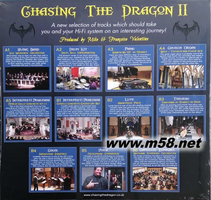追龍之樂 (二) CHASING THE DRAGON 第二集 滴水 2 (集錦) 黑膠(m58.net) 英國 Chasing The Dragon 追龍之樂絕對是近年來最受人矚目的發燒傳奇。創辦人 Mike Valentine 以他在電影錄音累積的 30 年經驗,破天荒展開直刻唱片以及盤帶同步錄音這項不可能的任務。因為直刻唱片不經混音處理,數量稀少,而聽感逼真,讓追龍迅速風靡世界! 這次追龍再度推出直刻錄音精彩匯集,以饗樂迷。本片收錄場面熱烈、動態爆棚的 Syd Lawrence 樂團的爵士演奏,以及精巧動人的古典室內樂,一刀未剪,帶來一鏡到底的暢快,更收錄倫敦地鐵呼嘯而過以及教堂管風琴的莊嚴聲響,重現身歷其境的逼真體驗。 Mike 更以 Neumanne U47 真空管麥克風捕捉精彩瞬間,帶來無上愉悅的美麗聽感。此張合輯一口氣收錄十七首精彩絕倫的錄音,以最為超值的重量級精選企劃,讓您體驗追龍錄音無可取代的快感。