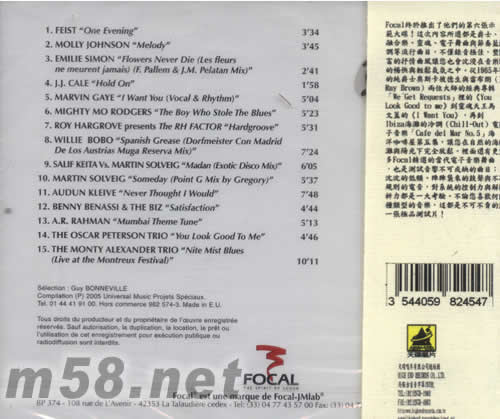 1、FEIST"One Evening" 2、MOLLY JOHNSON"Melody" 3、EMILIES SIMON"Flowers Never Die(Les fleurs ne meurent jamais)(F.Pallem&J.M.Pelatan Mix)" 4、J.J.CALE"Hold On" 5、MARVIN GAYE"I Want You(Vocal& Rhythm)" 6、MIGHTY MO RODGERS"The Boy Who Stole The Blues" 7、ROY HARGROVE presents The RH FACTOR"Hardgroove" 8、WILLIE BOBO"Spanish Grease(Dorfmeister Con Madrid De Los Austrias Muga Reserva Mix)" 9、SALIF KEITA Vs.MARTIN SOLVEIG"Madan(Exotic Disco Mix)" 10、MARTIN SOLVEIG"Someday(Point G Mix by Gregory)" 11、AUDUN KLEIVE"Never Thought I Would" 12、BENNY BENASSI & THE BIZ"Satisfaction" 13、A.R. RAHMAN"Mumbai Theme Tune" 14、THE OSCAR PETERSON TRIO"You Look Good Me" 15、THE MONTY ALEXANDER TRIO"Nite Mist Blues(Live at the Montreux Festival)"