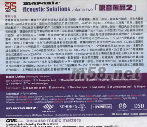 原音極品2 SACD示范天碟(m58.net) 本專輯經(jīng)過長時(shí)間的籌備及各場(chǎng)地測(cè)試后才正式進(jìn)行錄制,承繼著第一集的[原音]錄音制作概念,得到各國音響品牌的認(rèn)同及參與錄制,這份光榮是值得我們感到驕傲的。荷蘭STS DIGITAL在不停追求在真實(shí)[原音]重播的理念驅(qū)使下,尋找在現(xiàn)今數(shù)碼科技年代而遺失了的原有音樂生命色彩,再從[原音]制作中尋回失去了的昔日真音樂感覺,讓這份具有自然氣色的音樂生命,可以綿綿不斷地延續(xù)下去。TRACK 1-7在STS DIGITAL自資錄音室進(jìn)行曲錄制,絕不添加任何人工回聲,是細(xì)工與分辨率要求甚高之錄音,因此每段錄音都仿佛令我們?nèi)谌肓吮硌萁M合當(dāng)中,就好像處身在現(xiàn)場(chǎng)一樣的感覺。而TRACD 8-13,在一所95平方米之WISSELOORD STUDIO 作現(xiàn)場(chǎng)錄制,后期制作上增加了回響效果,完全可感覺到直接和貼面的形體,真實(shí)的樂器外貌及那所WISSELOORD STUDIO的現(xiàn)場(chǎng)空間感,好像活生生呈現(xiàn)眼前。在這兩個(gè)風(fēng)格與聆聽感覺大相徑庭的作品,全張專輯使用上SILTECH PRO S3最新頂級(jí)金銀線與SCHOPES CMC-6錄音咪收音,配合TASCAM HR-78作16 CHANNEL頻比錄音。為了發(fā)行SACD高質(zhì)素重播制式更使用WEISS之AD/DA CONVERTER 作為后期制作。13首GYPSY作品與本專輯收錄硬件配合得天衣無縫,無論是樂器的真實(shí)度,音色潤醇而不膩,自然流暢,輕松動(dòng)聽,現(xiàn)場(chǎng)氣氛濃厚;那種逼真,豐富與飽滿的感覺非筆墨可以形容。MARANTZ結(jié)合了高科技與優(yōu)越設(shè)計(jì)水平,朝著真實(shí)[原音]的重播理念方向,卓著的工程師創(chuàng)造了表現(xiàn)和感覺也值得驕傲之MARANTZ SA-1551 SACD播放機(jī)和PM-1551放大器推出面世,為慶祝這完美的立體聲重播組合的誕生,本專輯亦任命為這組音響名器的專屬示范音樂軟件。