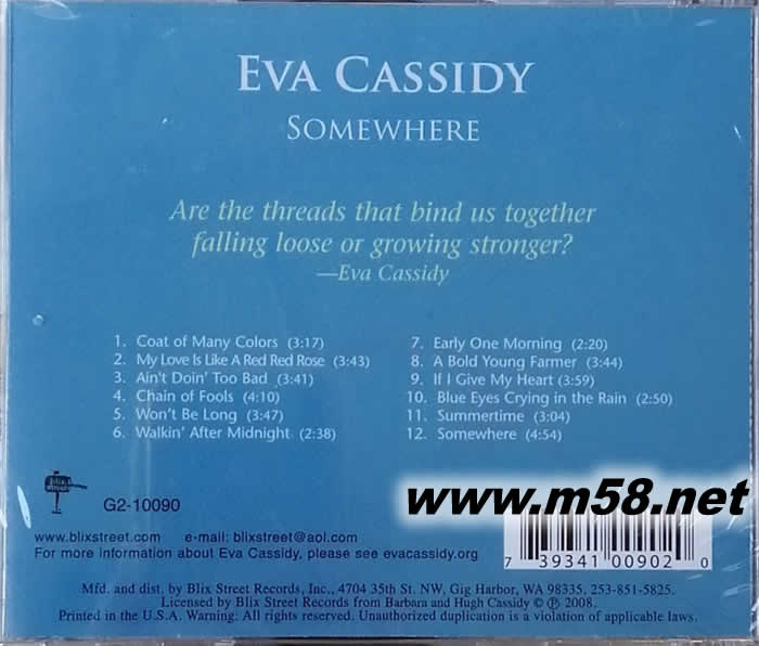 SOMEWHERE隨便哪里(m58.net) 本輯是第一張收錄Eva cassidy本人創作歌曲的專輯!Eva cassidy的音樂成為市場一致肯定的心靈歌聲,她的專輯最近更掀起全球搶購.樂壇對于她的一致評價都非常高,這張和其它幾張Eva專輯同樣是必買的!