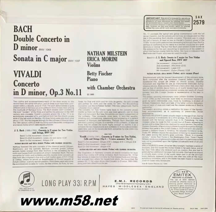 Bach: Concerto for 2 Violins/ Sonata/ Vivaldi: Concerto Grosso 巴赫: 2首雙小提琴協奏曲/ 韋瓦第: 大協奏曲 180g 33RPM LP 黑膠(m58.net) 立體聲傳世銘盤;黃金陣容組合,絕對珍藏 古典黑膠樂迷拼死以求,必備精品 英國原裝進口; EMI原廠音源精心轉製