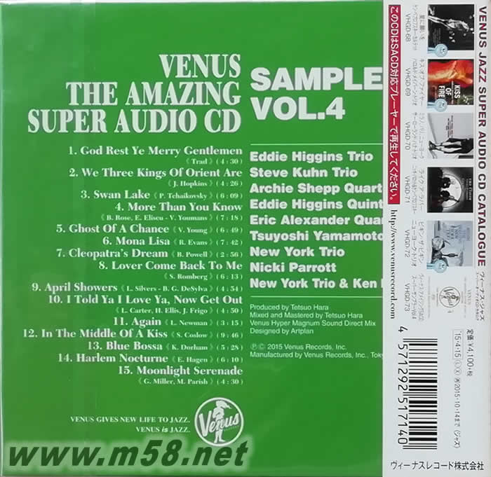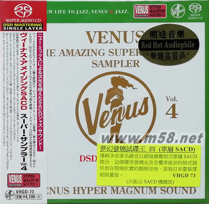 夢幻發燒試碟王 4 VENUS THE AMAZING Super Audio CD SAMPLER VOL.4(限量單層SACD)(m58.net) 日本著名發燒爵士品牌Venus Records選輯旗下十五首超正錄音,多位音樂名家及歌手分別演繹多首名曲如: ,多位名家的精彩演出帶來了永恒的經典金曲,以單層SACD推出,這個備受發燒友及音響界推崇的制式提供如在現場欣賞的靚絕音效。原裝日本豪華厚紙限量版。(只能以SACD機播放)