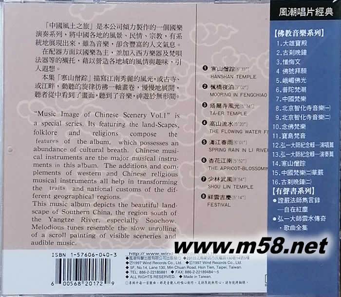 寒山僧蹤(m58.net) 音樂的中國風土之旅 ☆成功結合傳統國樂器、電子音樂、梵唄法器,打破舊有音樂美學,賦予中國樂曲新生命。 ☆豐沛的人文氣息,奠立中國風土民情音樂創作的里程碑。 ☆連續5年( 80~85年)榮膺全國齋僧大會指定音樂;深入人心的經典之作,是最受好評及歡迎的音樂專輯。