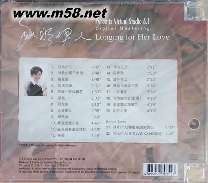01. 秋水伊人 02. 教我如何不想他 03. 梅娘曲 04. 玫瑰三愿 05. 送我一枝玫瑰花 06. 早秋 07. 飛花歌 08. 天涯歌女 09. 可憐的秋香(對唱) 10. 我愿是只小燕 11. 花兒為什么這樣紅 12. 春游 13. 我的花兒 14. 四季歌 15. 塞外村女 16. 妹妹找哥淚花流 17. 二月里來 18. 鄉(xiāng)戀曲 19. 都達爾和瑪麗亞 20. 明月之夜 BONUS TRACK 21. 秋水伊人(德國老虎魚制版) 22. 秋水伊人(日本JVC K2-HD制版)