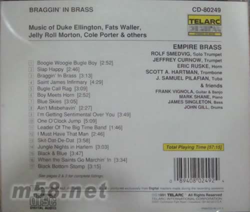大吹大擂的銅管爵士樂五重奏GRAGGIN IN BRASS(m58.net) 這張CD共包含17首曲子,有美國爵士樂早期流行全世界的名曲。帝國銅管五重奏是北美洲最好的銅管樂團,他們為這些早己成為經典之作的旋律賦予新的時代意義,不模仿古人,不標新立異,也不講究過分的學術氣氛,銅管五人和他們的朋友,以一種輕鬆而即興的心情,嚴謹的態度,像是做家庭作業似地把這些曲子演奏出來,在沒有聽到這張專輯前,很難想像他們的音樂世界是如此地具有包容和再創能力,相信一定可以吸引更多的爵士樂迷和古典愛好者。