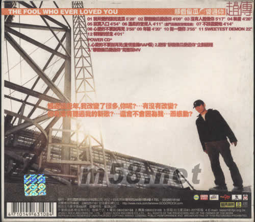 01. 我所愛的讓我流淚 02. 那個傻瓜愛過你 03. 沒有人能像你 04. 執著 05. 寂寞入口 06. 溫柔的查甫人(金門高梁廣告指定曲) 07. 不該還愛她 08. 心愛的不要說再見 09. 年輪 10. 每一個你 11. SWEETEST DEMON 12. 特別的想念 POWER CD 01. 心愛的不要說再見(重情重義RAP版) 02. 趙傳"那個傻瓜愛過你"企劃過程 03. "那個傻瓜愛過你"完整版MV