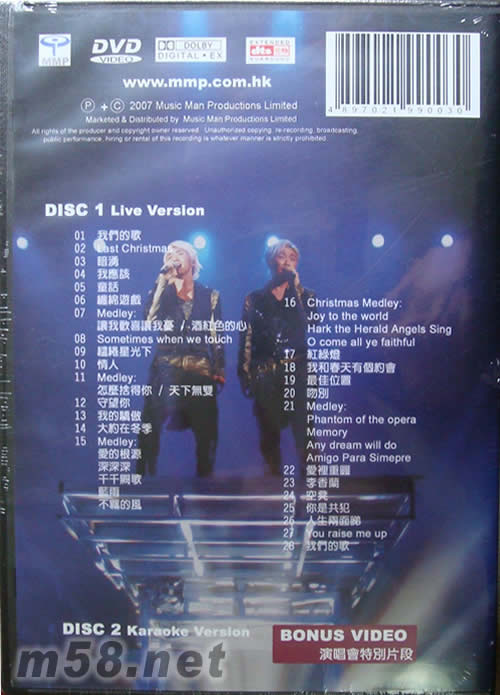 Disc 1 - Live Version 01. 我們的歌 02. Last Christmas 03. 暗涌 04. 我應(yīng)該 05. 童話 06. 纏綿游戲 07. 讓我歡喜讓我憂 + 酒紅色的心 08. Sometimes When We Touch 09. 繾綣星光下 10. 情人 11. Medley: 怎么捨得你 / 天下無雙 12. 守望你 13. 我的驕傲 14. 大約在冬季 15. Medley: 愛的根源 / 深深深 / 千千闕歌 / 藍(lán)雨 / 不羈的風(fēng) 16. Christmas Medley: Joy To The World / Hard The Herald Angels Sing / O Come All Ye Faithful 17. 紅綠燈 18. 我和春天有個約會 19. 最佳位置 20. 吻別 21. Medley: Phantom Of The Opera / Memory… / Any Dream Will Do/ Amigo Para Simepre 22. 愛里重圓 23. 李香蘭 24. 空凳 25. 你是共犯 26. 人生兩面睇 27. You Raise Me Up 28. 我們的歌 Disc 2 - Karaoke Version Bonus Video: 演唱會特別片段