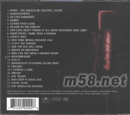 1、INTRO-YOU SHOULD BE DANCING/ALONE 2、MASSACHUSETTS 3、TO LOVE SOMEBODY 4、WORDS 5、CLOSER THAN CLOSE 6、ISLANDS IN THE STREAM 7、OUR LOVE (DON‘T THROW IT ALL AWAY)FEATURING ANDY GIBB 8、NIGHT FEVER/MORE THAN A WOMAN 9、LONELY DAYS 10、NEW YORK MINING DISASTER 1941 11、I CAN’T SEE NOBODY 12、AND THE SUN WILL SHINE 13、NIGHTS ON BROADWAY 14、HOW CAN YOU MEND A BROKEN HEART 15、HEARTBREAKER 16、GUILTY 17、IMMORTALITY FEATURING CELINE DION 18、TRAGEDY 19、I STARTED A JOKE 20、 GREASE 21、JIVE TALKIN 22、HOW DEEP IS YOUR LOVE 23、STAYIN ALINVE 24、YOU SHOULD BE DANCING