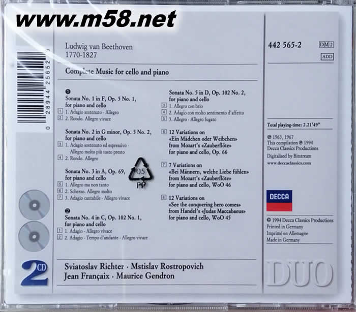 大提琴與鋼琴BEETHOVEN COMPLETE MUSIC FOR CELLO AND PIANO(白色封面雙CD)(m58.net) 羅斯特羅波維奇的《貝多芬:大提琴和鋼琴奏鳴曲全集》,在2009年《企鵝古典唱片指南》中推薦為四星。 貝多芬《大提琴和鋼琴作品全集》不僅被《企鵝唱片指南》評為四星,而且《日本唱片藝術名盤300》也評為權威版本。 貝多芬寫了五首大提琴奏鳴曲,雖然數量不多,但是卻涵蓋他重要的創(chuàng)作時期。第三號獻給貝多芬的摯友暨大提琴家,年輕的葛萊亨斯坦男爵。羅斯特羅波維奇與Richter的搭檔這一回完成三連霸,羅斯特羅波維奇身為當今大提琴演奏泰斗,此版1961年的決定性演出,獲五位評論員一致的推崇。以總得分24分的優(yōu)異成績稱霸,就算再多的形容詞,也無法形容本版的偉大。第五號與第四號大提琴奏鳴曲一樣都是三樂章的古典形式,曲風呈現晚期圓熟的風韻,與第四號的幽默相比,第五號宗教含意較濃。羅斯特羅波維奇以豐富想像力的自發(fā)思考,揮灑出第五號奏鳴曲的魅力。與Richter細膩的對話,對聽者的誘惑力相當強大。——摘自《唱片圣經》 在唱片史上,羅斯特羅波維奇、Richter這兩位大師大師堪稱典范的錄音屬于該套作品的決定性版本,于1963年和1967年以立體聲方式錄音留存于世,Philips再將當年的LP經現代數碼混音改善,于1994年推出雙CD套裝,把這部分名演一次性收錄,更添收藏價值。